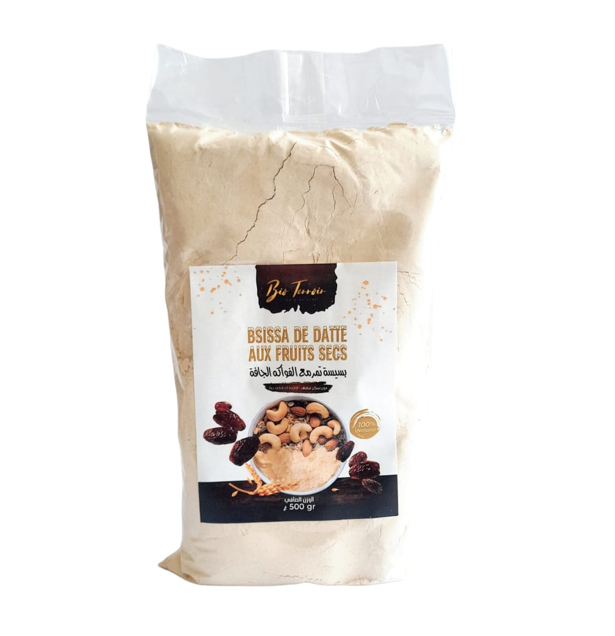 La bsissa Bio terroir aux dattes et fruits secs est un produit du terroir est une préparation à base de poudre de datte et de blé et de fruits secs sans sucre ajouté