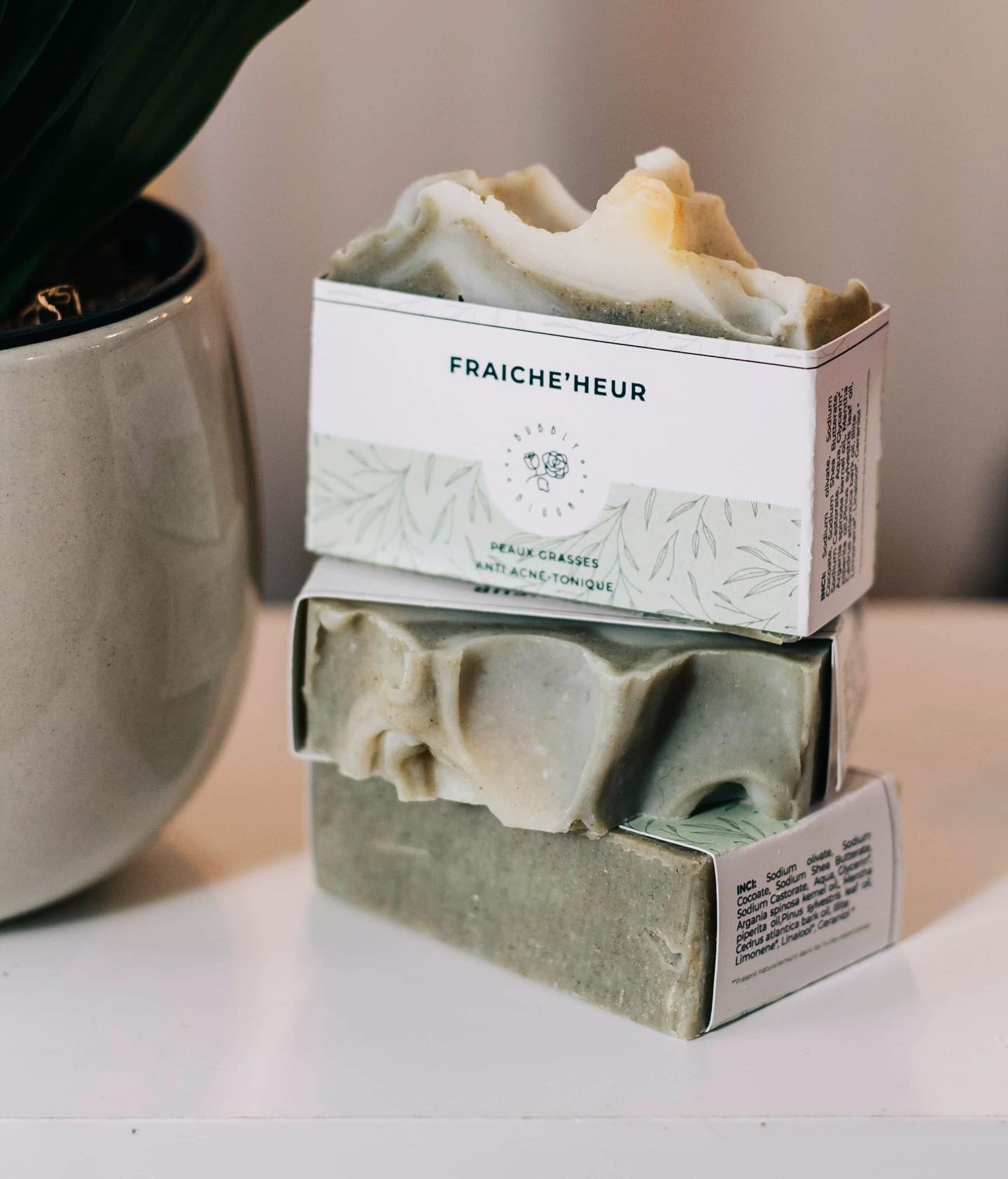 Eau-huile d’olive-huile de coco-beurre de karité-huile de ricin- glycérine naturelle obtenue lors de la saponification- huile d’argan en surgas-argile verte-huile essentielle de Menthe poivrée.